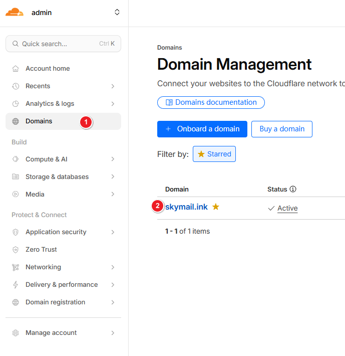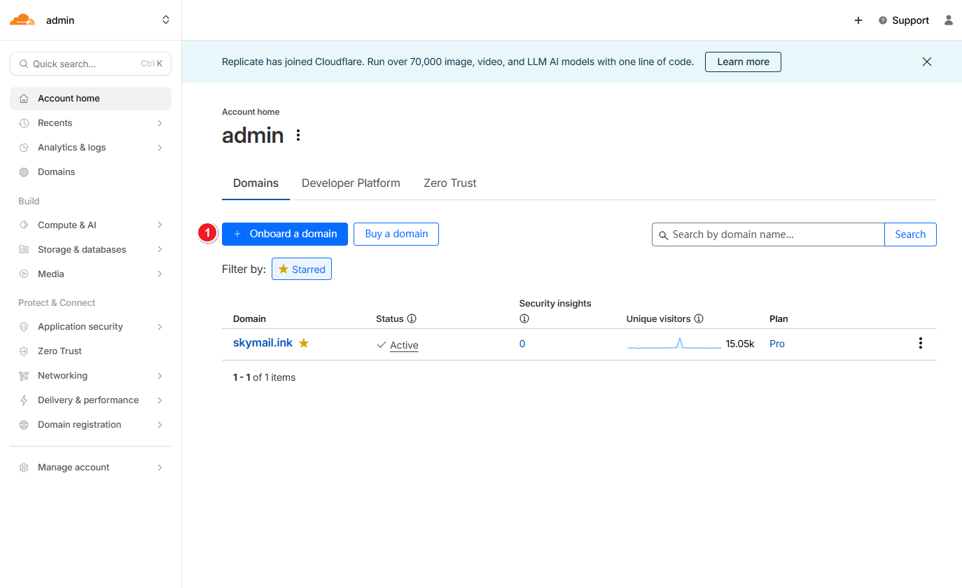 Register a Cloudflare account at https://dash.cloudflare.com and add your domain.