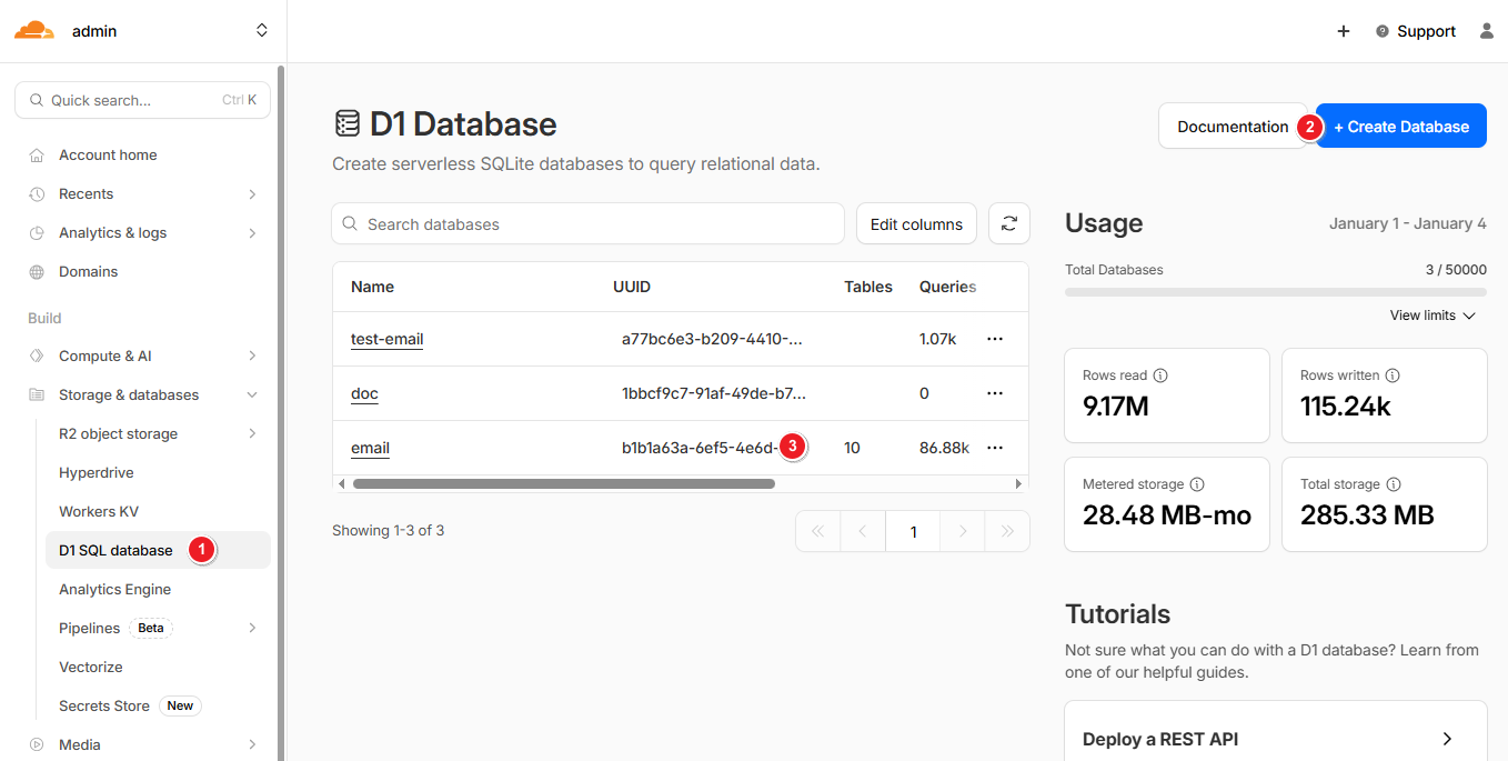 Create a D1 database and copy its ID, which will be used later when configuring the environment.
